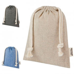 Saco de presente feito de algodão reciclado certificado GRS com fecho de cordão de algodão. Ideal para presentear ou armazenar itens. Tamanho: 15 x 20 cm. Materials : Algodão reciclado Certificates :GRS, BSCI Default print option : Serigrafia - frontal - max color : 1 - 100 x 120 mm Para este produto, o fornecedor concluiu todos ou parte dos dados GPSR. Para mais informações, contacte o fornecedor.15X20CM / AZUL MISTURADO;NEGRO MESCLADO;