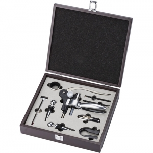 Conjunto de nove acessórios para vinho: duas rolhas, uma bandeja coletora, um termômetro, um cortador de cápsulas, um funil e um saca-rolhas. Feito de aço inoxidável e apresentado em uma caixa de madeira. Colors : castanho Materials : Metal/Aço Inoxidável Certificates : Heavy Metals (nr 12), Cadmium (nr 2), PAHs (nr 4), Phthalates (nr 13), AZO Dyes/Amines (nr 18), SVHCs (nr 22), Formaldehyde (nr 30), PCP (nr 39), LFGB (nr 56).Ø 27.5 x 24 x 8.5 cm / CASTANHO;