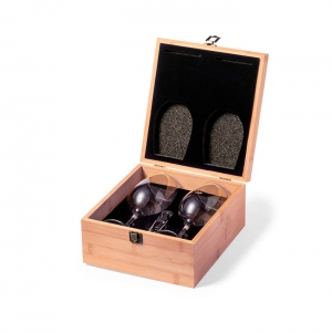 Conjunto de vinhos em elegante estojo de bambu com interior recortado em espuma. Inclui 2 copos de cristal de 350 ml e saca-rolhas de 2 tempos em aço inox, com corta cápsulas. Apresentação em caixa individual de design kraft. 2 Copo de Vinho 350 ml. Saca-Rolhas Abre-Cápsulas Aço Inox Composition : Bambu.S/C;